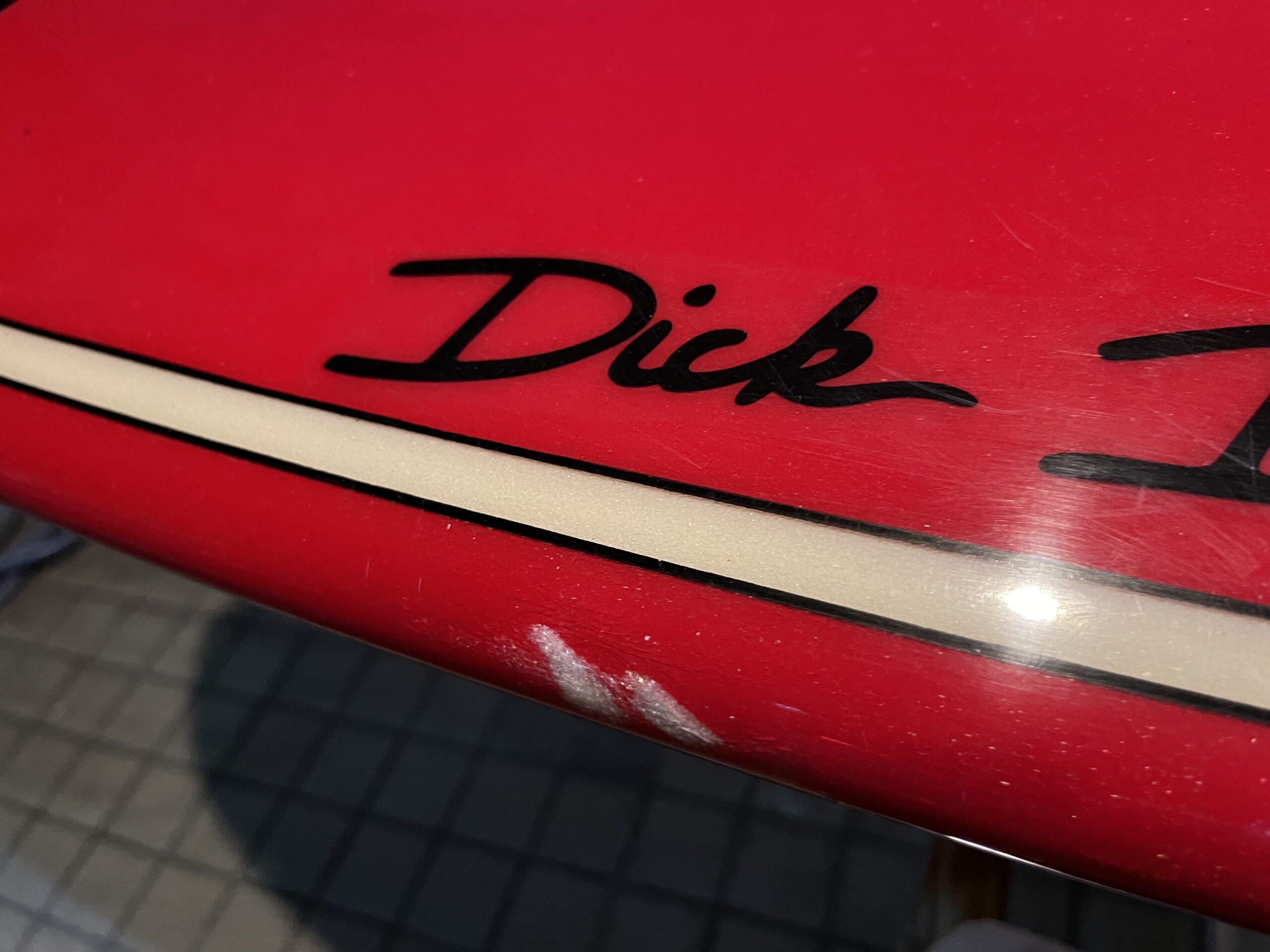 ロングボードのレールのリペア。赤色を調合して色合わせをしました。